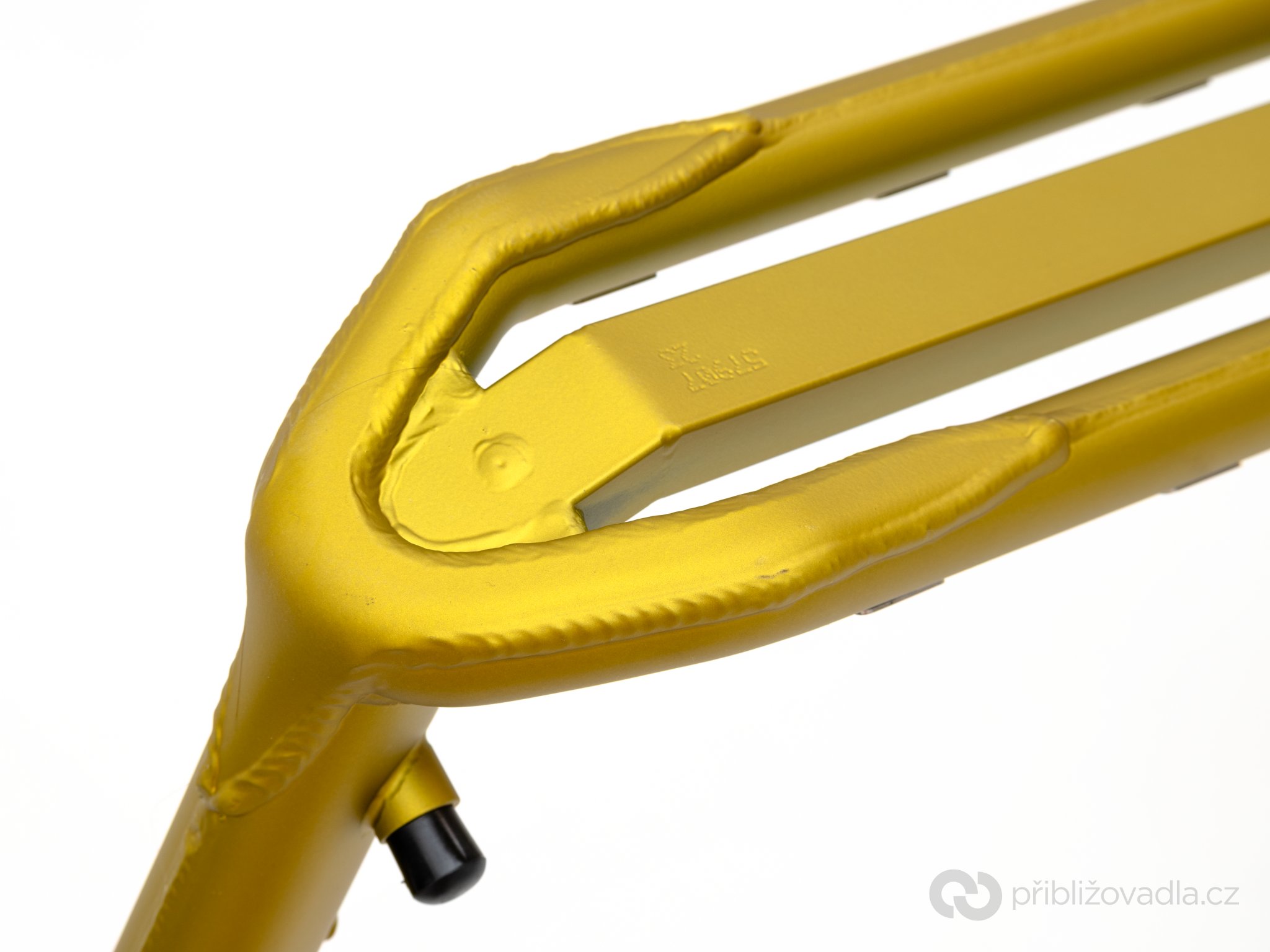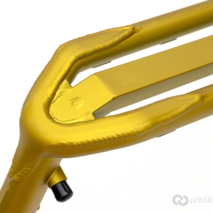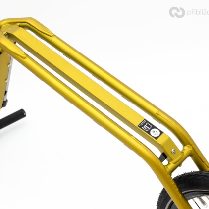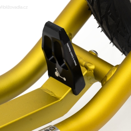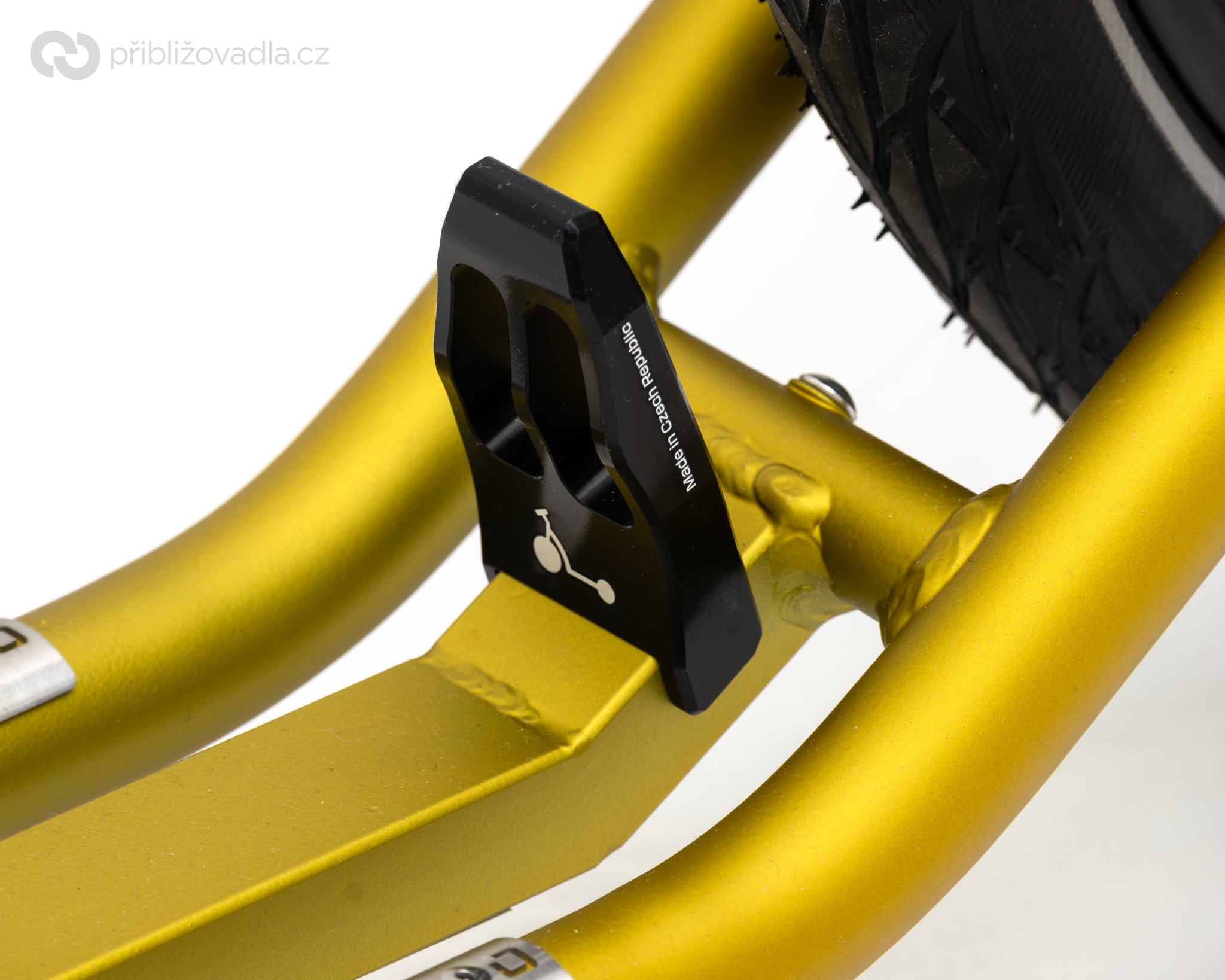Zatímco „klasická“ Tourka má stupátko po celé délce stejně široké (110 mm), u modelu Tour Pro se směrem dozadu mírně rozšiřuje, abychom na konci zadní vidlice naměřili šíři 125 mm. A to je luxus, přátelé! Na trhu neexistuje jiná koloběžka, která by byla osazená kotoučovými brzdami a zároveň měla tak úzkou zadní stavbu. Abych byl přesný: terénní Kickbike Cross Fix (27,5/20″) má samotnou vidlici ještě užší, ale „přečuhující“ třmen brzdy optimistickou cifru šířky zadní stavby 115 mm poněkud kazí (130 mm). Další modely s kotoučovými brzdami už jsou na tom ale hůře. Crussis Cobra Sport 142 mm, Yedoo Trexx Disc 145–160 mm (bez–vč. třmene a rychloupínáku). Tudíž znovu opakuji, Kostka Tour Pro (G7) má zadní stavbu luxusně úzkou. A to je samozřejmě u koloběžek této velikostní kategorie, osazených kotoučovými brzdami, významné plus.
