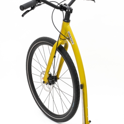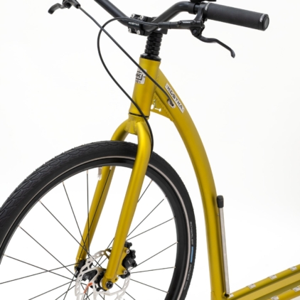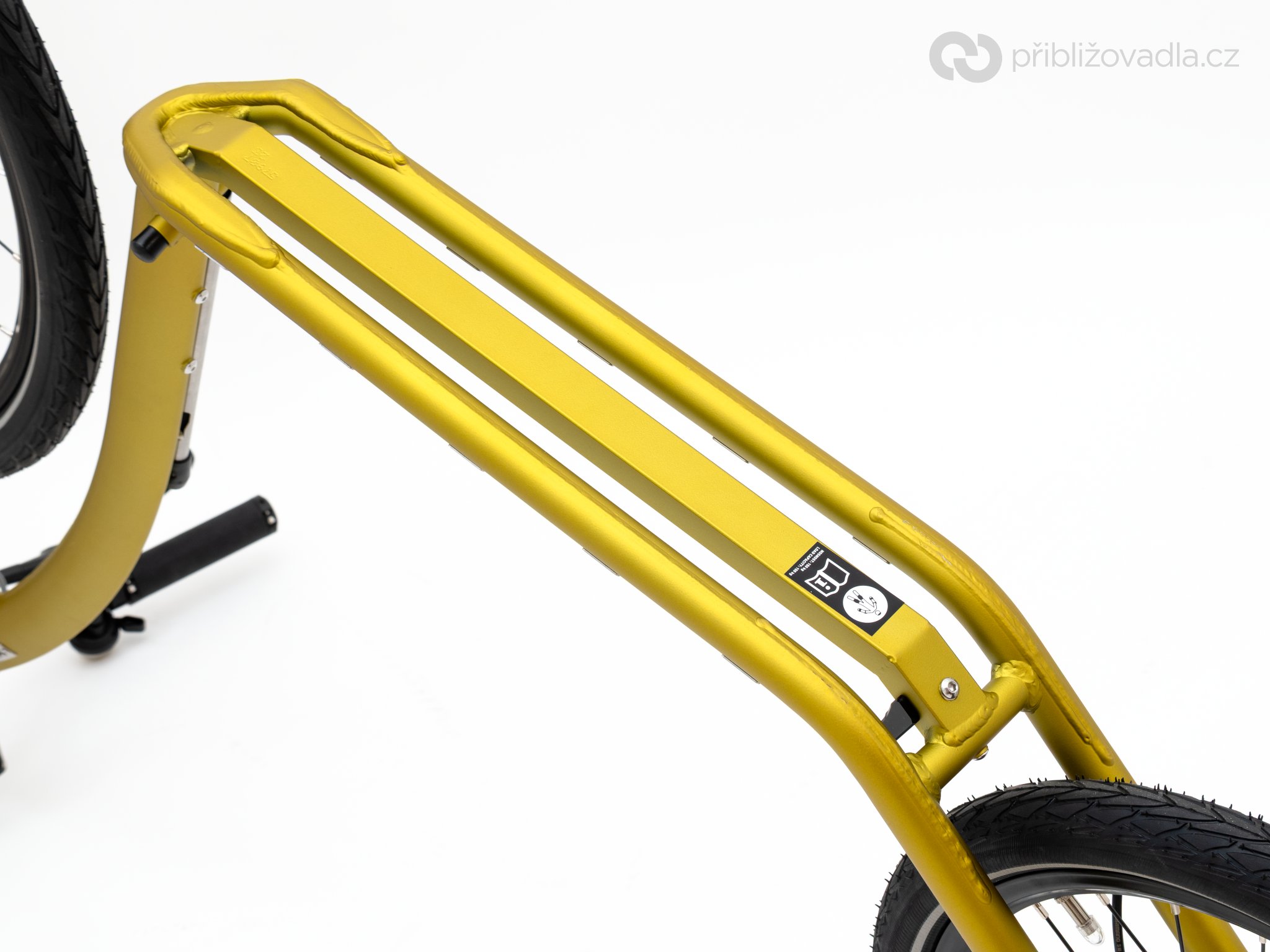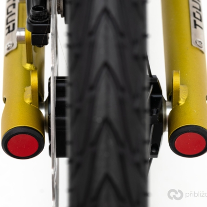 Ale jen pro pořádek a pro ty, kteří ještě nikdy nic neslyšeli o koloběžce Kostka Tour: Jedná se sedmou generaci stroje s koly 26/20 palců se svým charakteristickým ocelovým rámem a nově hliníkovou přední vidlicí. Nejmodernější generace využívá kola s pevnými osami, což se významně projevuje na tuhosti. No a brzdy, jak už víte, nejsou u modelu Tour Pro klasicky koloběžkově véčkové, nýbrž jde o hydraulické kotoučovky. Více o sedmé generaci koloběžek Kostka najdete v našem starším článku.