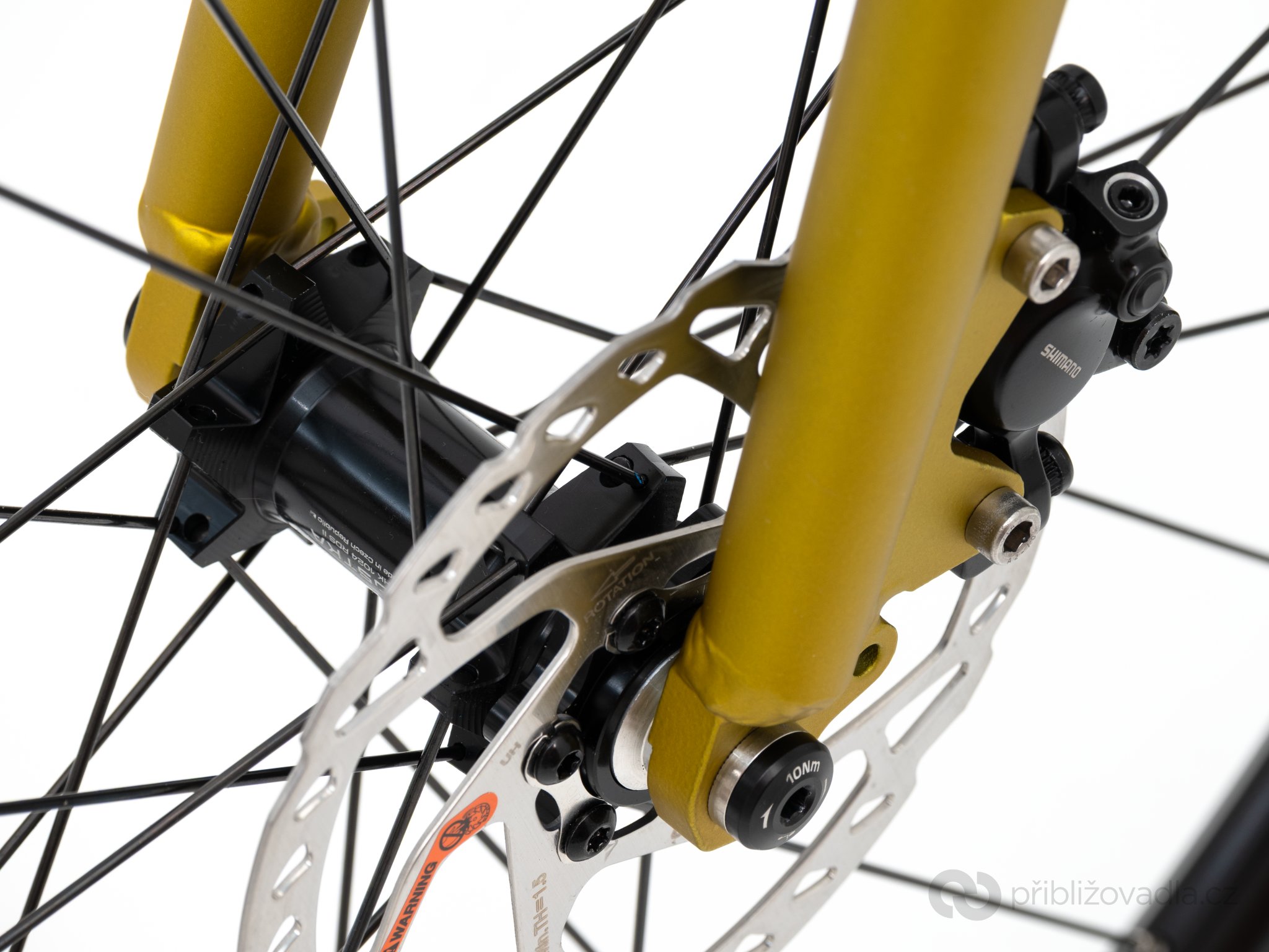 Brzdové kotouče se šestišroubovým uchycením trůní na nábojích, pocházejících z vývojových a produkčních dílen firmy Kostka – kolobka. Černě eloxované náboje mají přímé uchycení drátů výpletu, a samozřejmě průmyslová ložiska. Čtyřiadvacet drátů výpletu musí stačit, řekli si u Kostky a… stačí. Kola se chovají vzorně, výplet je patřičně tuhý, ani při velmi prudkém brzdění se (přední) kolo nijak nekroutí či nedělá jinou neplechu. Ostatně kola u Kostků díky vlastní vyplétací lince umí výborně.