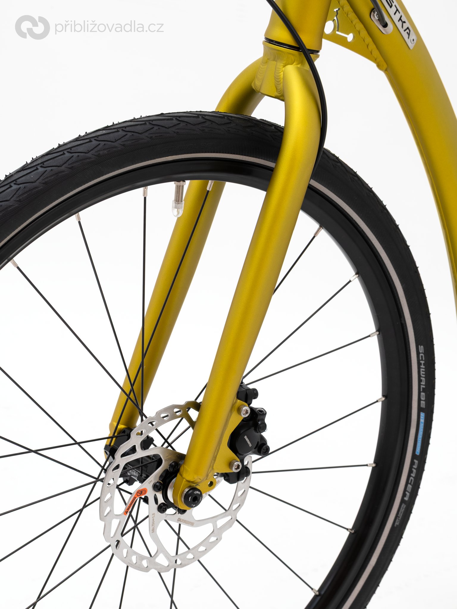 No a pak je tu to nejdůležitější – brzdný výkon a jeho ovládání. U mechanických kotoučovek je porovnání s véčky mnohdy sporné, nicméně hydraulické kotoučové brzdy zpravidla vždycky brzdí lépe než ráfkové. Ve většině situací si i u „obyčejných“ brzd, jaké jsou na Kostce Tour Pro (G7), vystačíte s jedním prstem na páčce, při prudkém brzdění holt ještě jeden přidáte. V dlouhých, několikakilometrových sjezdech nemusíte mít obavy z přehřátí ráfků (a nebezpečí bouchnutí duše), byť tedy kotouče se dovedou také pěkně vybarvit do červena :-) Ale do takového extrému se patrně jen tak nedostanete.